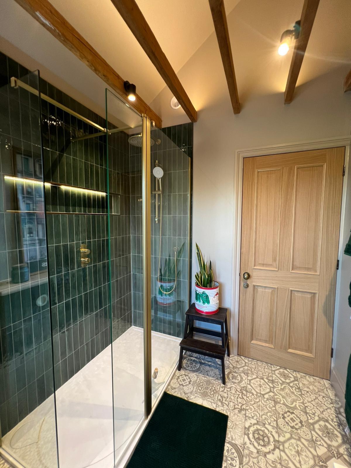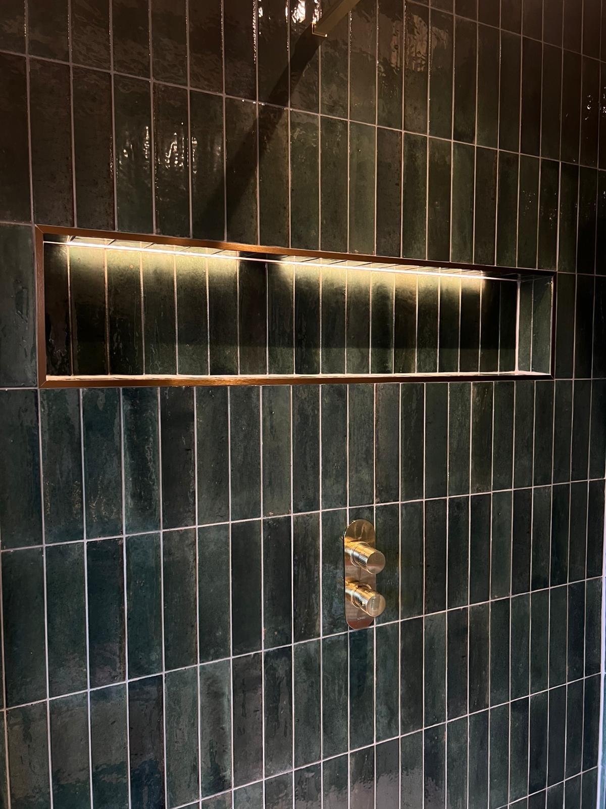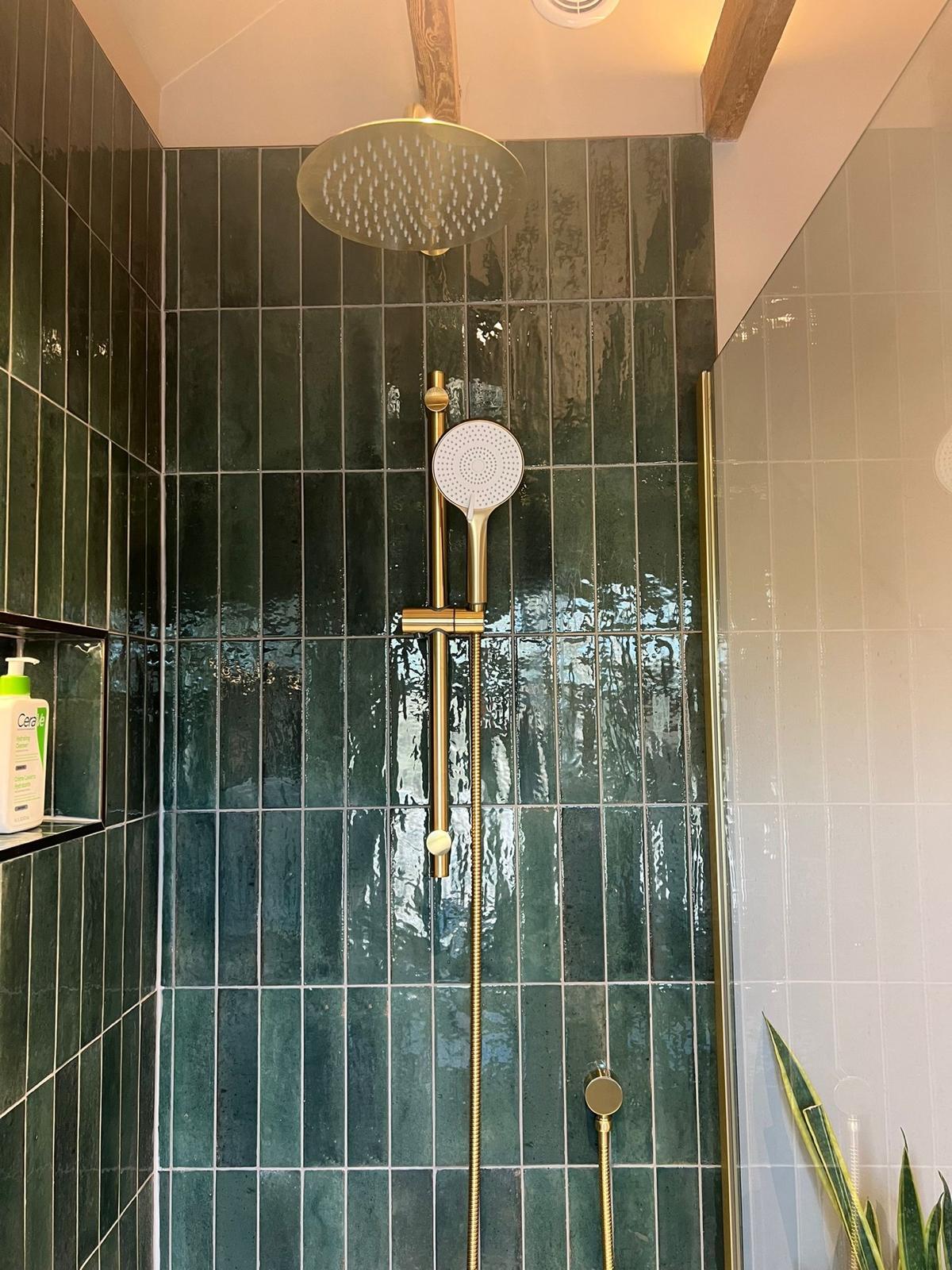 Step into elegance with our latest shower room installation, thoughtfully designed to harmonise with the timeless character of our customer’s home. We began by carefully removing the original ceiling, beautifully exposing the wooden beams above. The ceiling was then expertly rebuilt into the eaves, enhancing the room’s spaciousness while soft, ambient lighting was introduced to cultivate a calm and luxurious atmosphere. Traditional-style sanitary ware was selected alongside striking brushed brass fittings and a matching enclosure, lending the space a refined, classic aesthetic. Underfoot, patterned tiles in a vintage motif evoke a sense of tradition, perfectly paired with forest green wall tiles set vertically for a rich, bold statement. To complete the sanctuary, we installed a bespoke tiled niche featuring integrated LED lighting, stretching gracefully along the length of the shower tray and providing both functionality and a gentle, modern glow. The result is a shower room that seamlessly blends heritage charm with contemporary comfort.