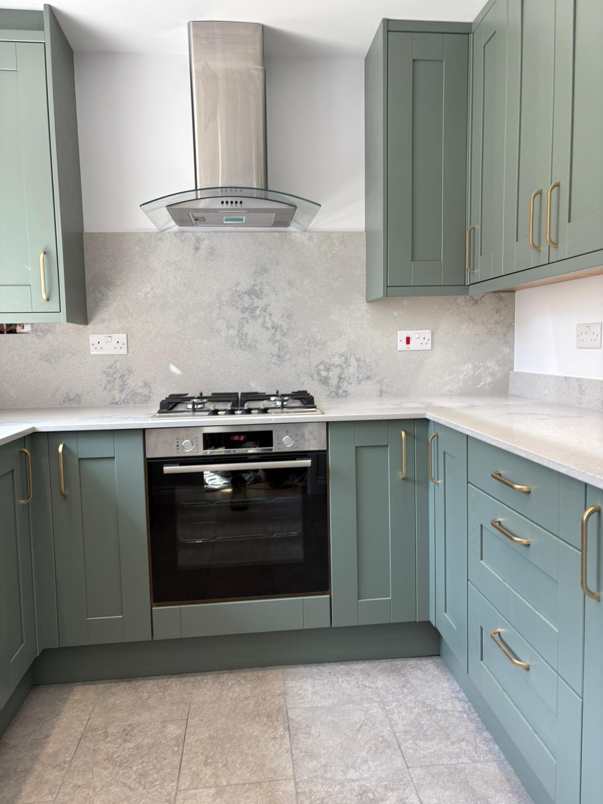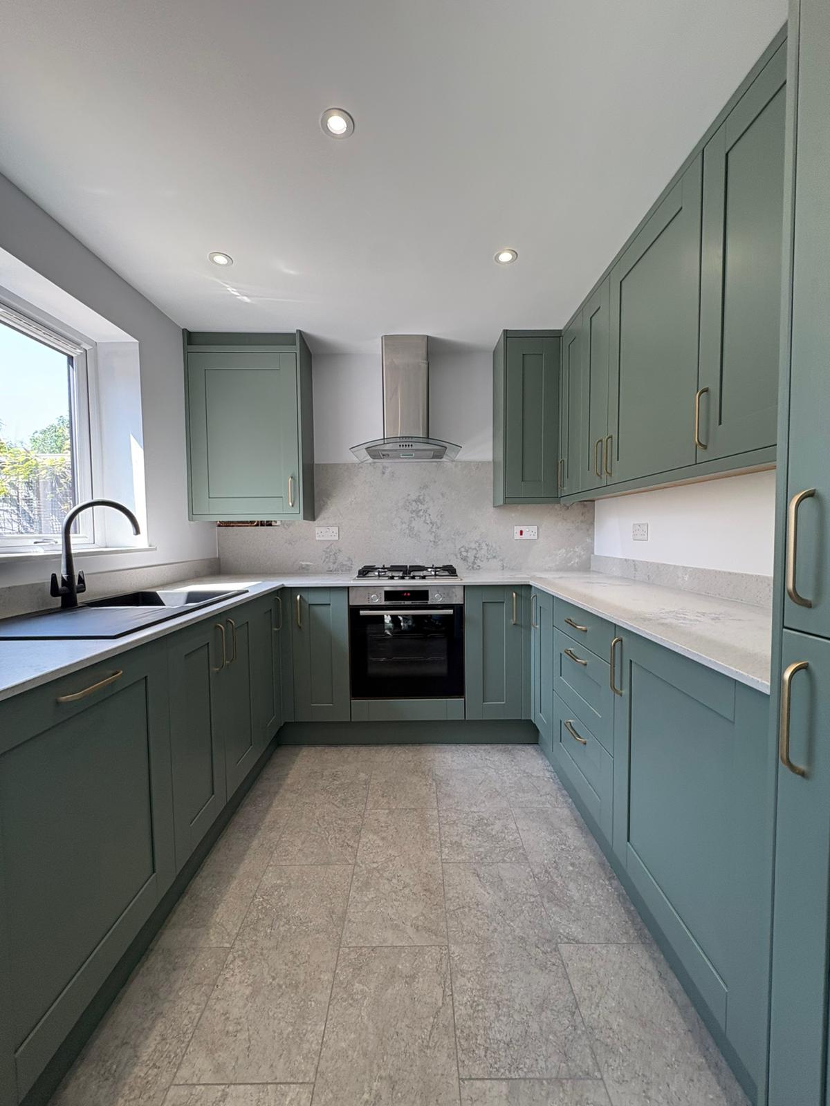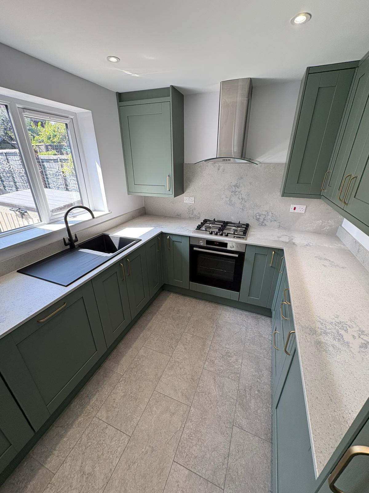 The Cambridge kitchen in reed green perfectly captures the timeless appeal of classic timber shaker cabinetry, elegantly enhanced with brushed brass handles for a touch of understated luxury. Under cupboard lighting softly illuminates the space, highlighting the sophisticated quartz work surfaces and upstand in Nile Stone Concrete Oyster, which are complemented by a full-height backsplash and window cill in matching concrete oyster for a unified finish. Integrated appliances blend effortlessly with the design, while the anthracite granite sink and mixer tap add both style and practicality. A tiled traditional floor brings the entire area together, creating a kitchen that feels both refined and inviting—ideal for modern living with a classic twist.