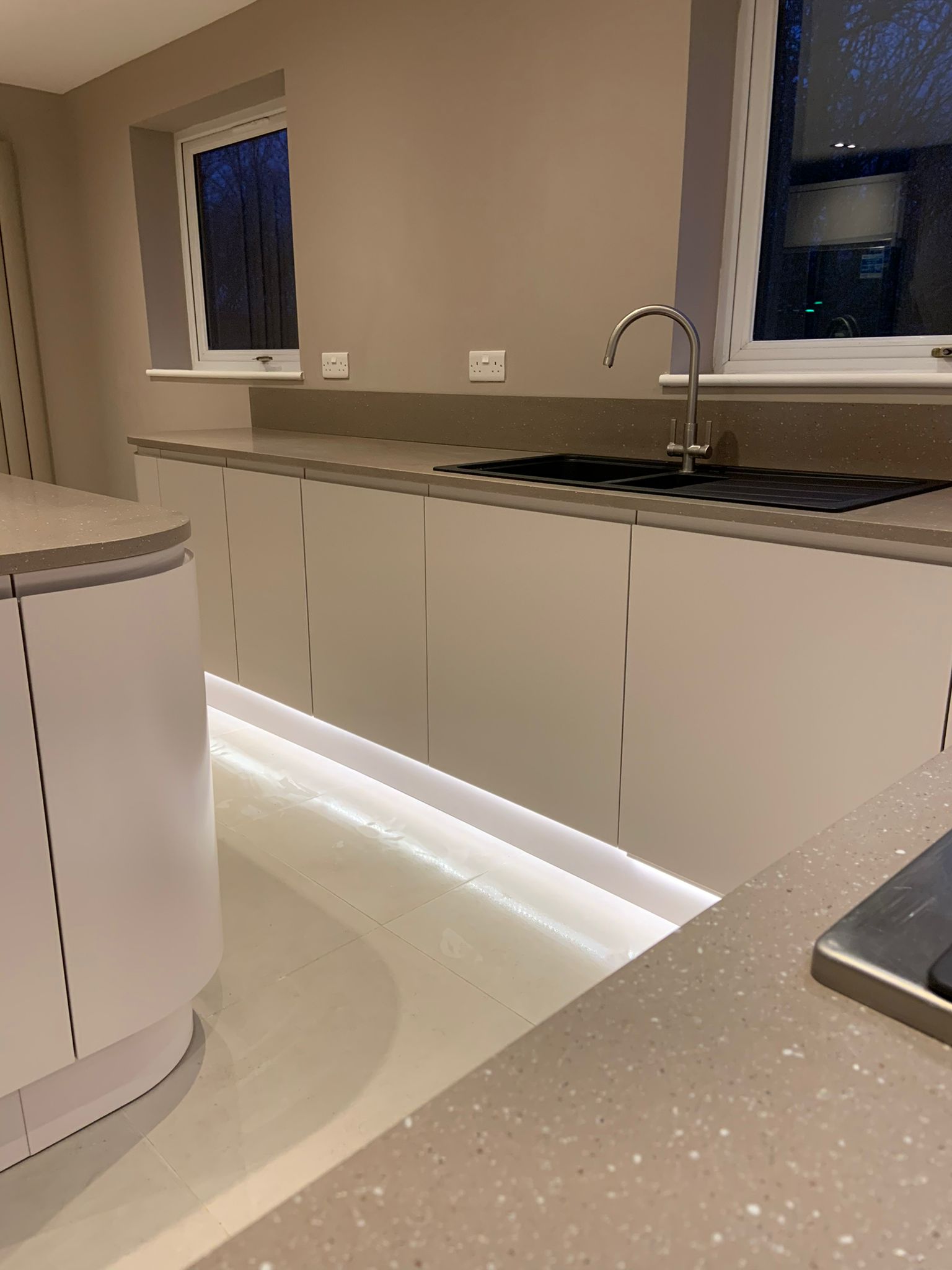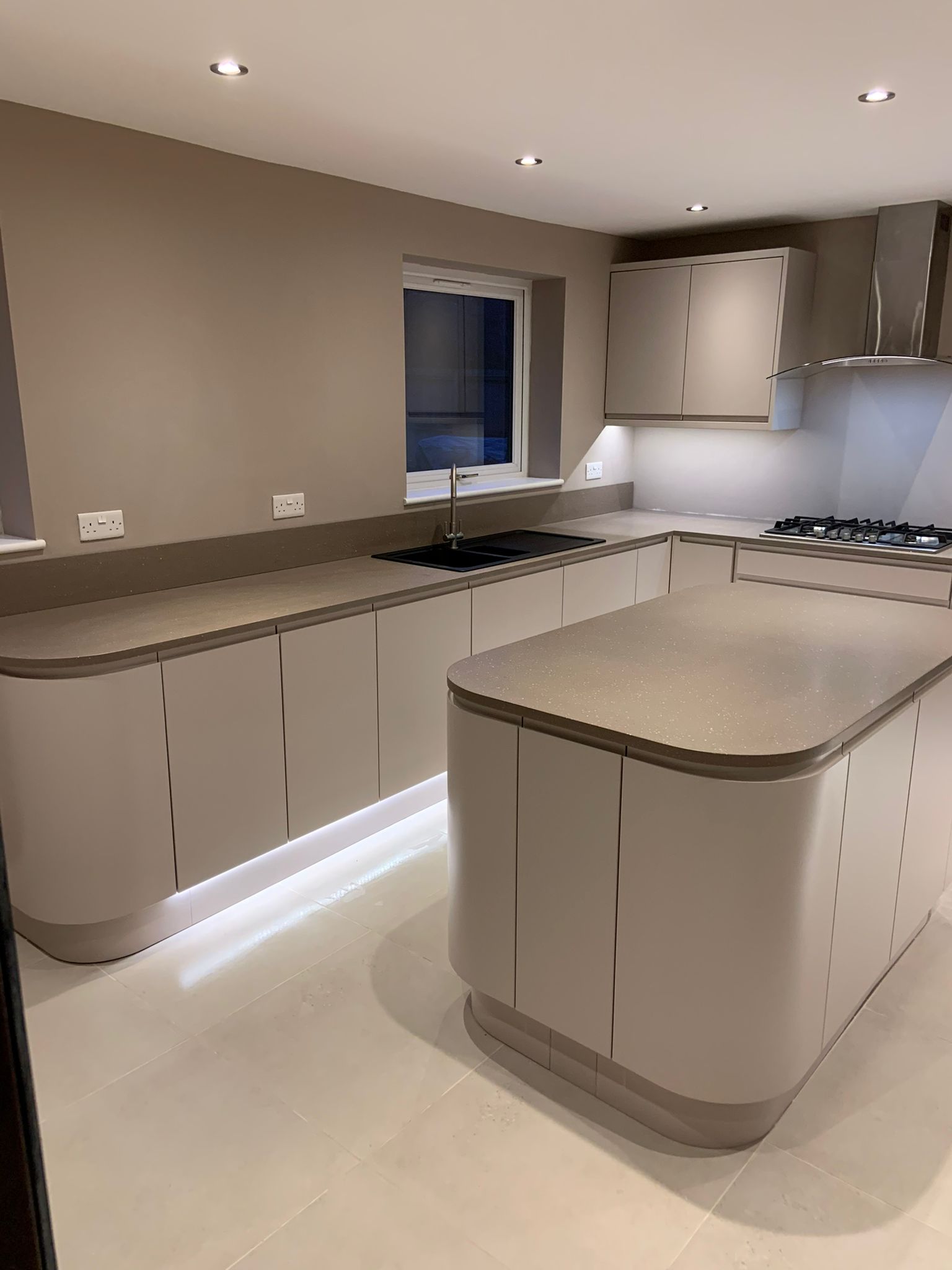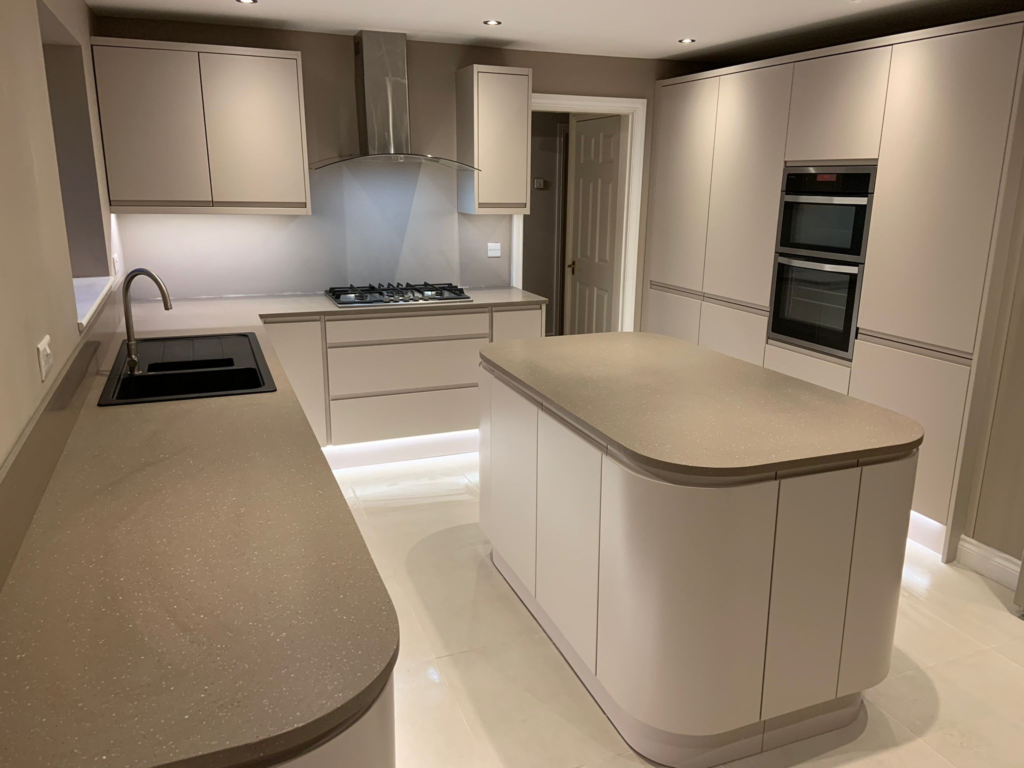 Showcasing the contemporary simplicity of Lucente Matt, this kitchen installation is a stunning example of handleless design at its best. Integrated appliances and a double oven are seamlessly housed within a bank of larders, creating smooth, uninterrupted lines that reinforce the modern look. Subtle plinth lighting brings a gentle warmth to the room, while the spacious central island offers maximum working and storage area. The work surface and upstand in Minerva Shimmer add a refined touch, perfectly complemented by the large-format sandstone floor tiles, creating a sophisticated and practical foundation for the entire kitchen.